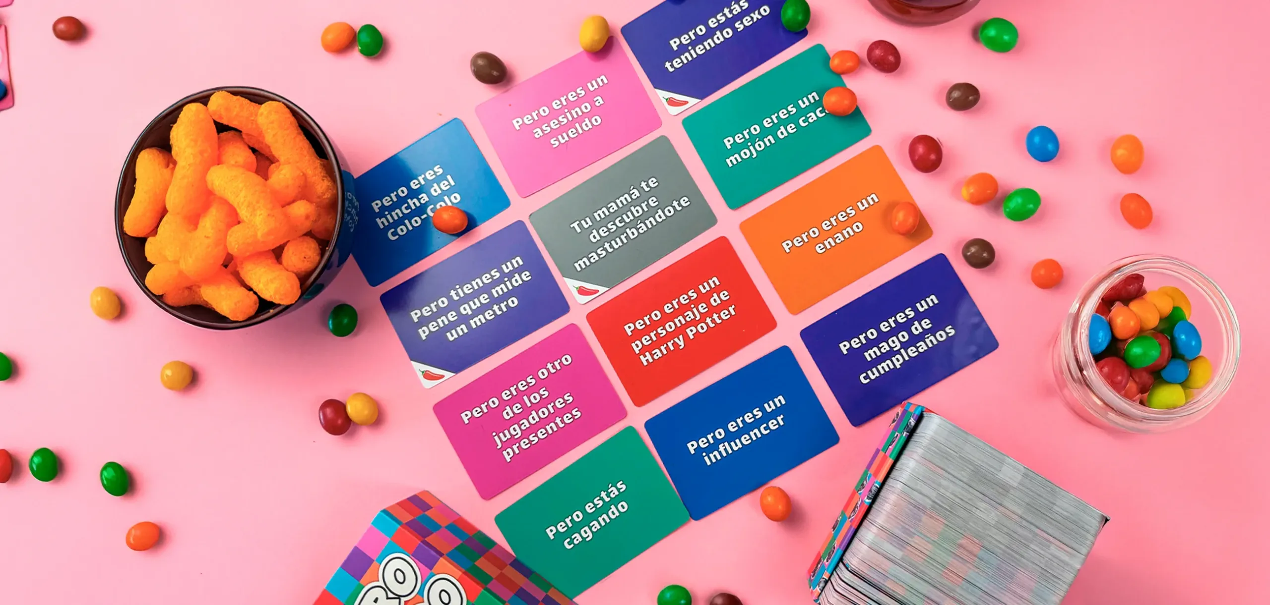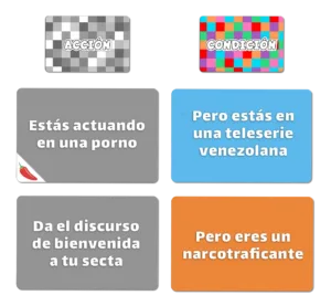 Solo se usan las cartas de acción y condición. Se juega en cualquier lugar: casa, patio, universidad, videollamada o hasta en un carrete al aire libre.